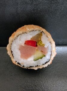 Amerikan roll ; Ryžiai , silpnai sūdyta kalakutiena , paprika , surio kremas, marinuotas ir šviežias agurkai , svuogunu laiškai