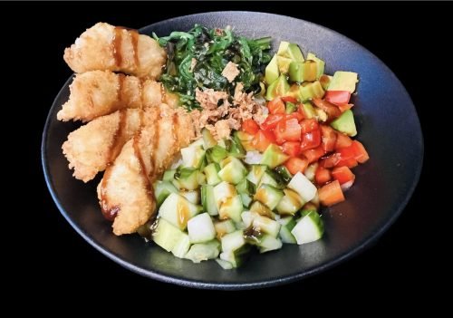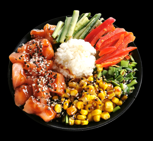 Nuostabaus skonio Poke bowl, mėgstantiems sočius patiekalus. Sudėtis: Sushi ryžiai, avokadas, agurkas, wakame salotos, paprika, svogūnų traškučiai, teriyaki vištiena, teriyaki/chipotle padažas.